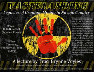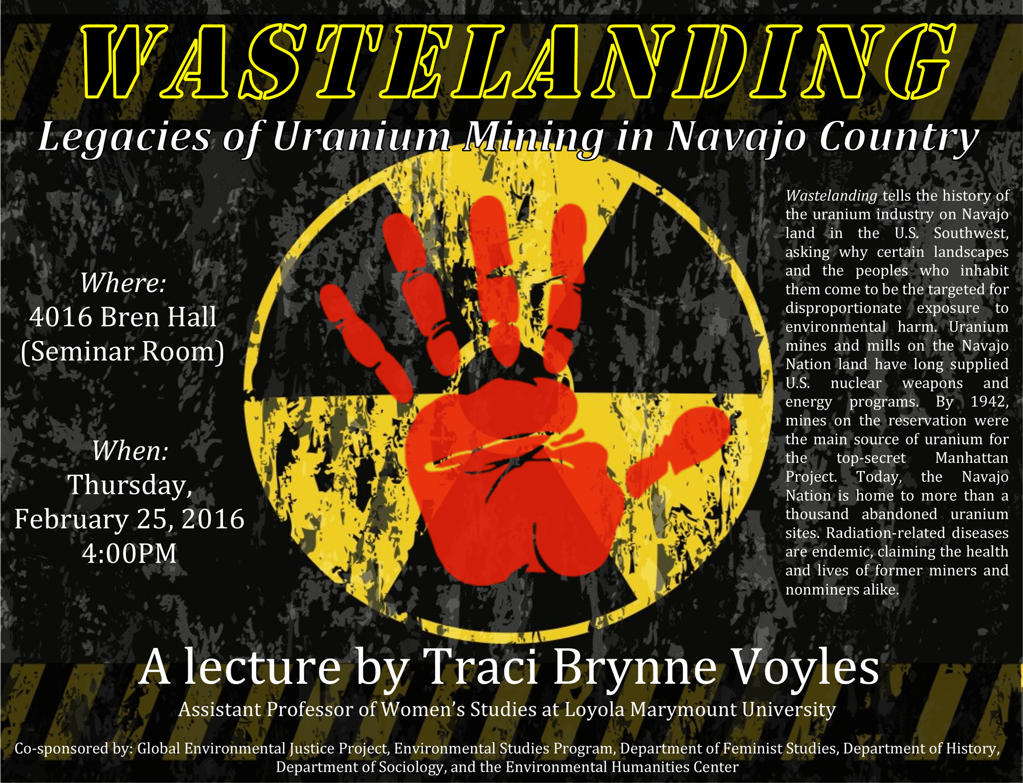Traci Brynne Voyles, author of the new book Wastelanding: Legacies of Uranium Mining in Navajo Country (University of Minnesota Press, 2015) spoke in Bren Hall, UCSB campus, at 4pm, Thursday, February 25, 2016.