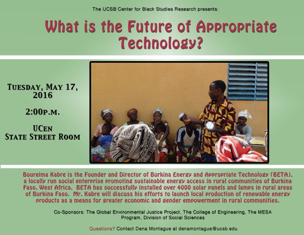 Boureima Kabre, founder of Burkna Energy and Appropriate Technology, spoke on “What is the Future of Appropriate Technology?” UCSB, UCen, State Street Room, May 17, 2016.