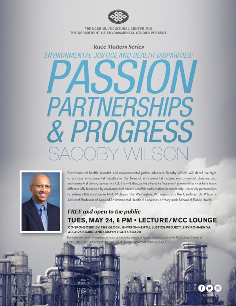 Dr. Sacoby Wilson is Assistant Professor with the Maryland Institute for Applied Environmental Health and Department of Epidemiology and Biostatistics at the University of Maryland-College Park. This event was part of UCSB’s MultiCultural Center’s Race Matters Series.