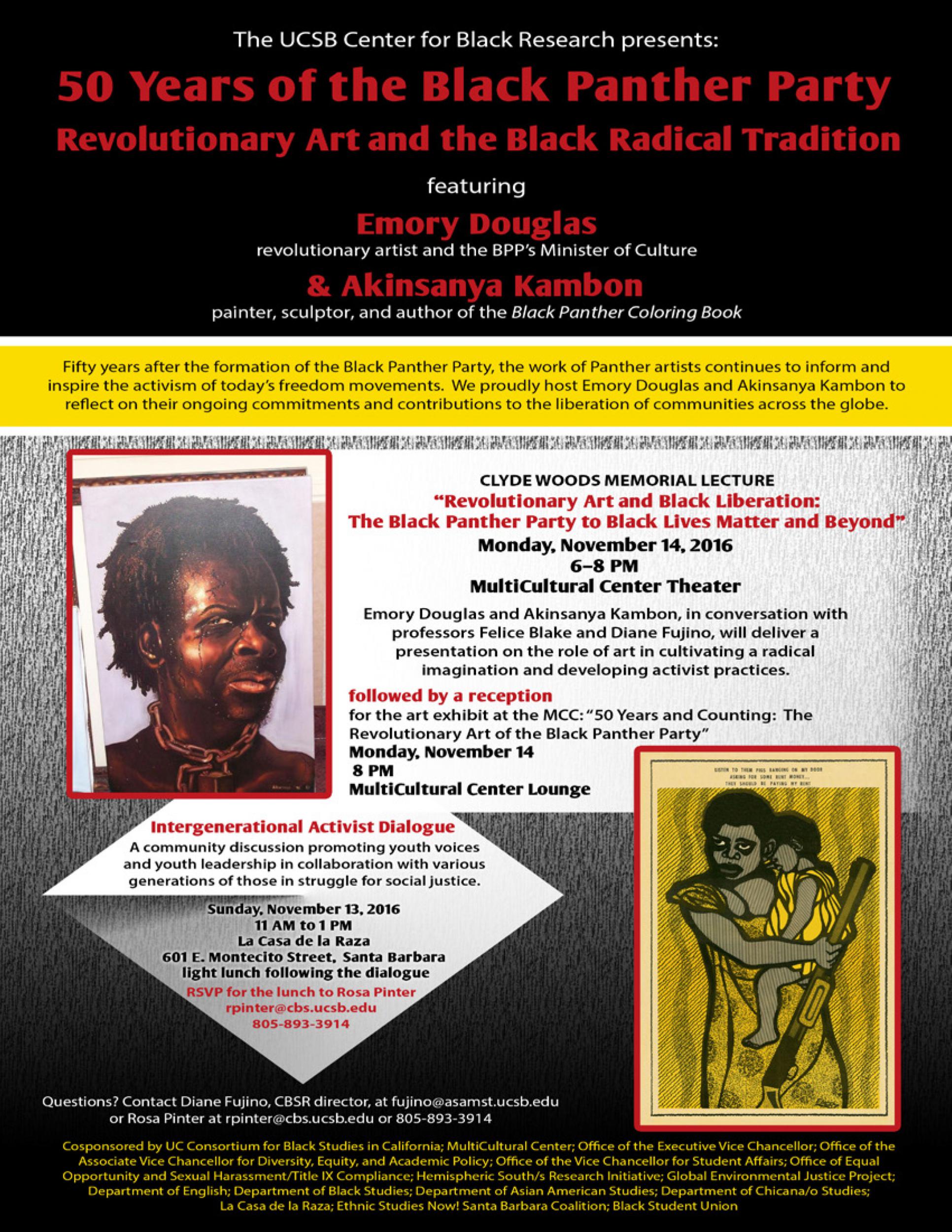 Emory Douglas and Akinsanya Kambon, in conversation with professors Felice Blake and Diane Fujino, will deliver a presentation on the role of art in cultivating a radical imagination and developing activist practices. The talk is followed by a reception for the art exhibit at the MCC: "5O Years and Counting: The Revolutionary Art of the Black Panther Party"