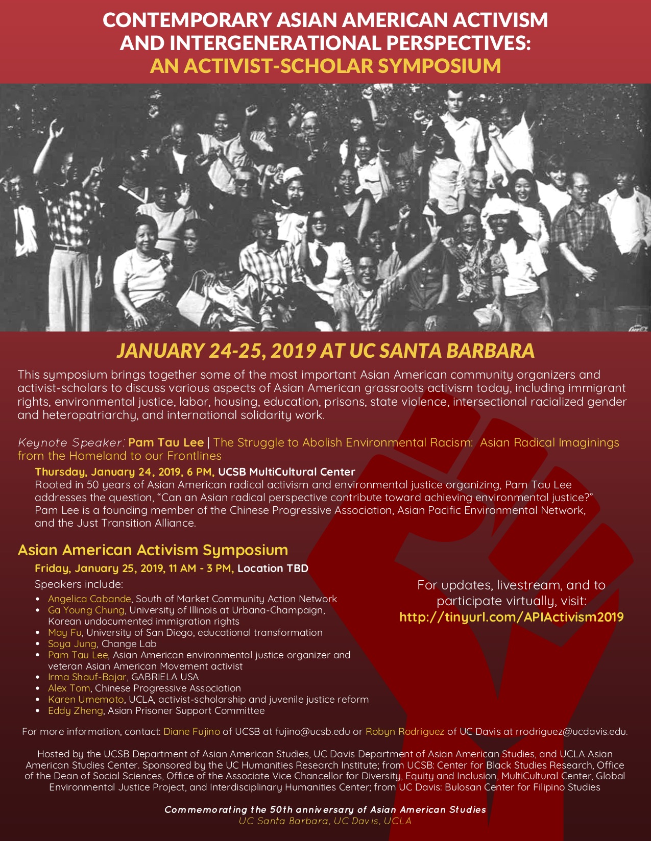 Hosted by the UCSB Department of Asian American Studies, UC Davis Department of Asian American Studies, and UCLA Asian American Studies Center. Sponsored by the UC Humanities Research Institute and from UCSB: Center for Black Studies Research, Office of the Dean of Social Sciences, Office of the Associate Vice Chancellor for Diversity, Equity and Inclusion, MultiCultural Center, Global Environmental Justice Project; from UC Davis: Bulosan Center for Filipino Studies.