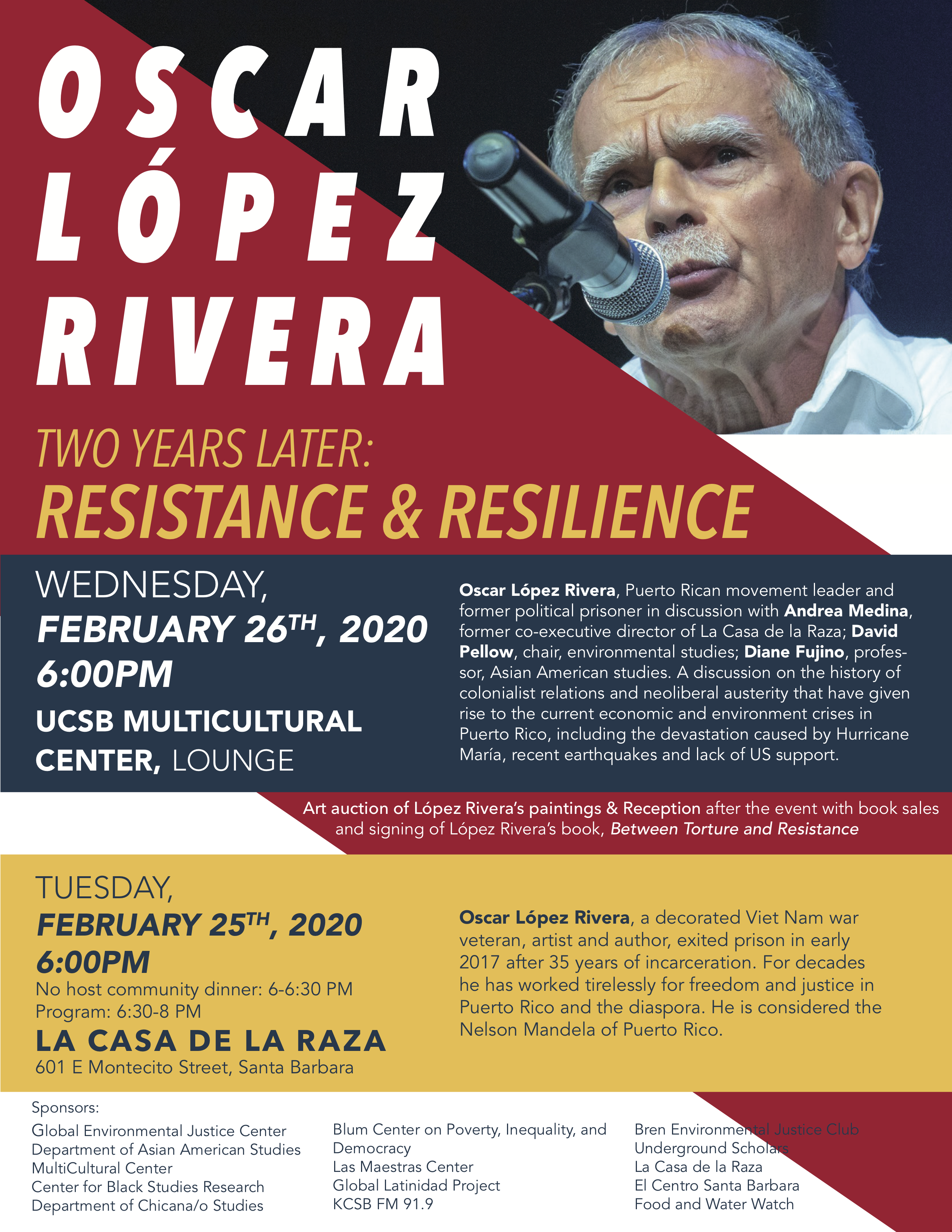 Join us for a community dinner with decorated Vietnam war veteran, artist and author, Oscar López Rivera. The no host community dinner will take place at La Casa de la Raza.